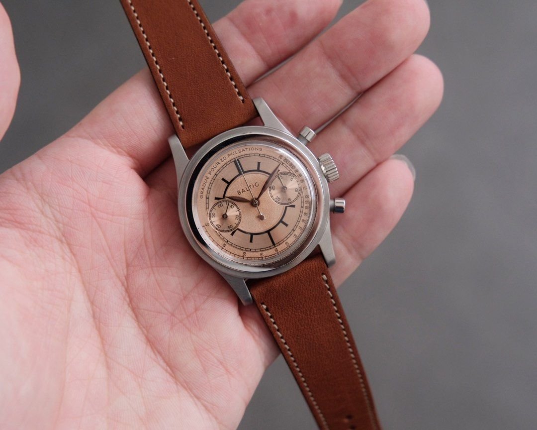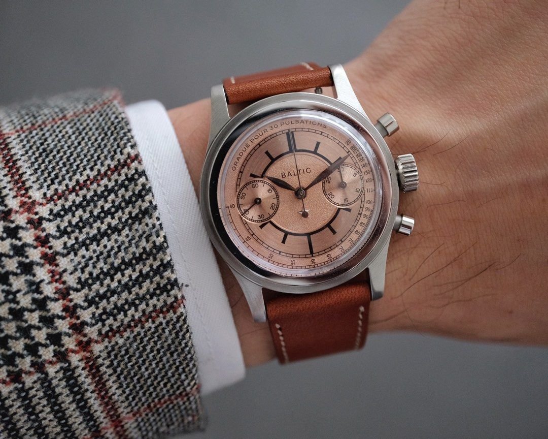 This lightly used Baltic Bicompax Pulso, a collaboration with Revolution and The Rake, features a striking salmon × sector dial with an applied Revolution star. Limited to 250 pieces, it blends vintage charm with modern precision. Powered by a manual-winding Seagull ST1901 movement, it offers chronograph functionality with a pulsometer scale, making it both stylish and practical. The watch comes with an unused light brown Italian calf leather strap; the bead-of-rice bracelet is not included. Trade offers welcome.