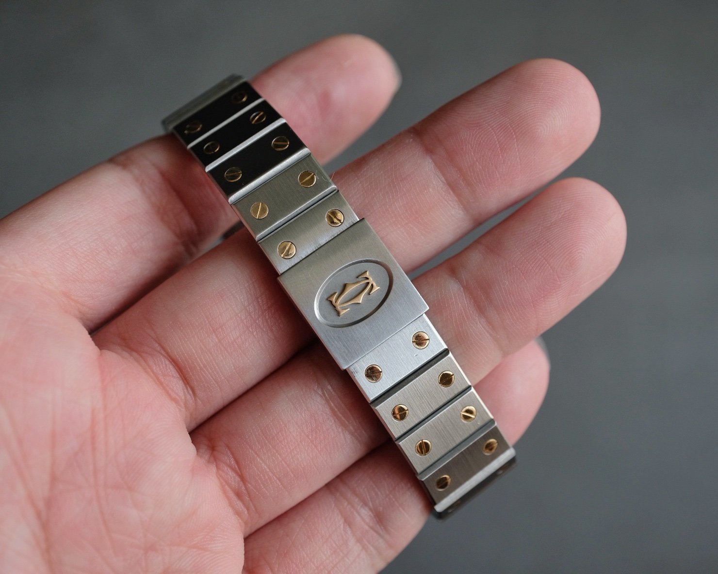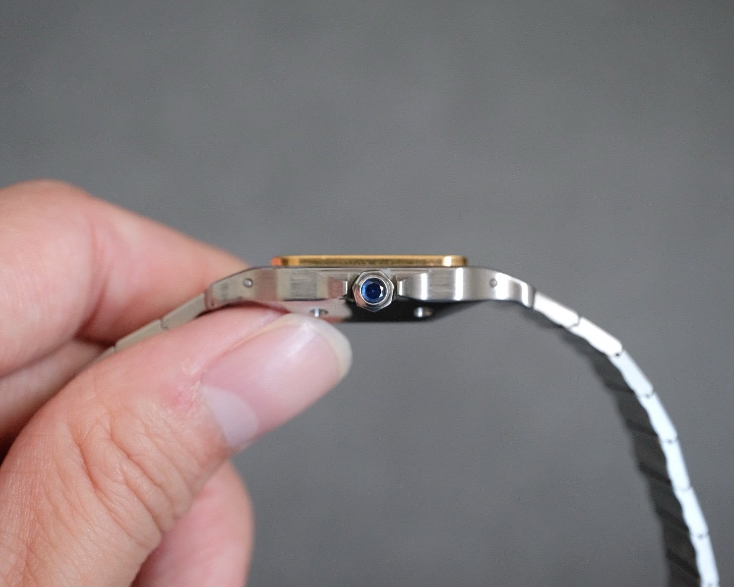 The Cartier Santos Carrée Ref. 2961 blends refined elegance with sport-chic design. Its two-tone case measures 29mm x 41mm, featuring a warm gold bezel, gold-accented bracelet screws, and finely brushed surfaces with bevelled edges. A blue sapphire cabochon crown with guards completes the look. The contrast grey ghost dial catches the light beautifully, paired with gilt sword hands and a discreet date at 3 o’clock. Inside, the automatic Cal. 077 (ETA 2671 base) delivers reliable performance with a 42-hour power reserve.
