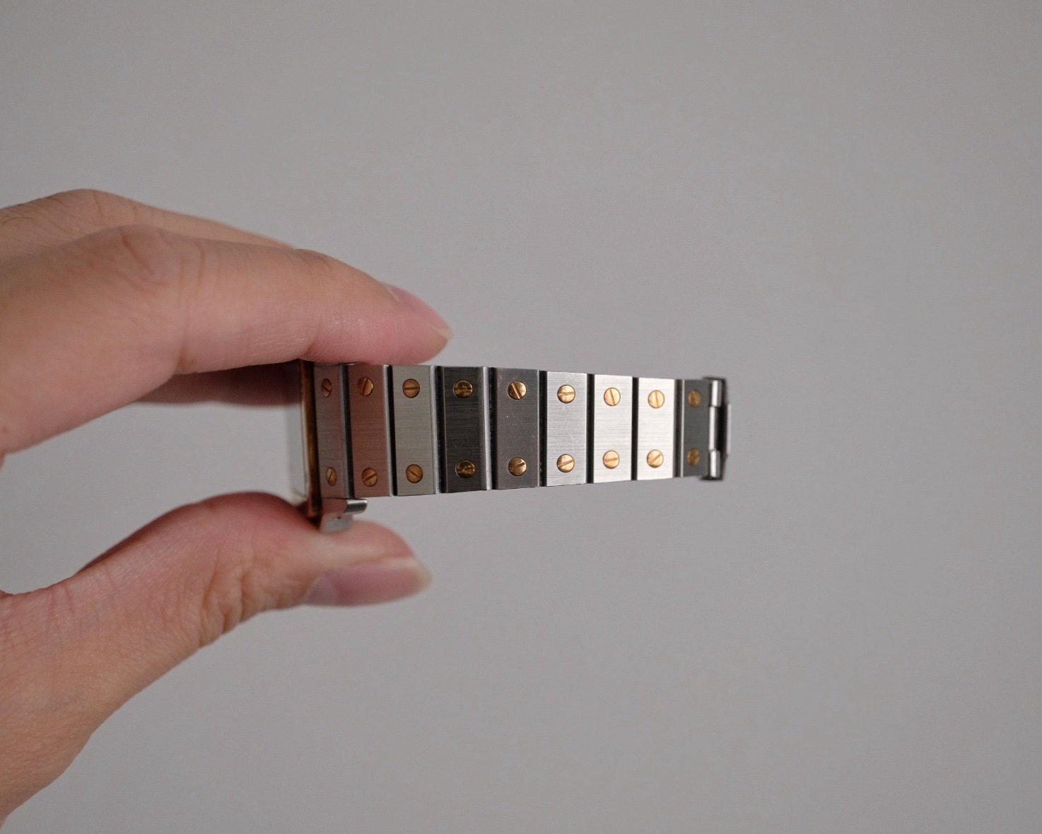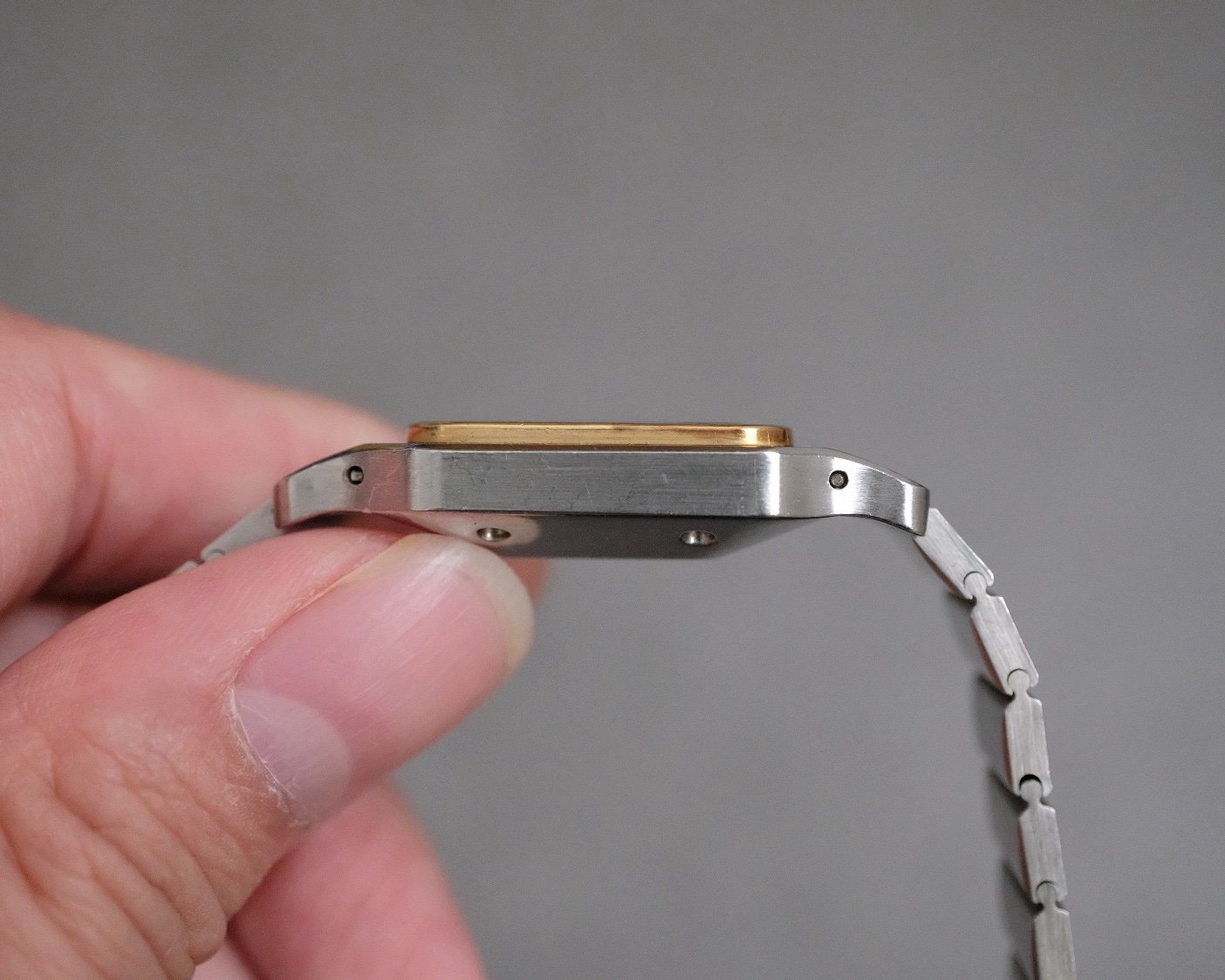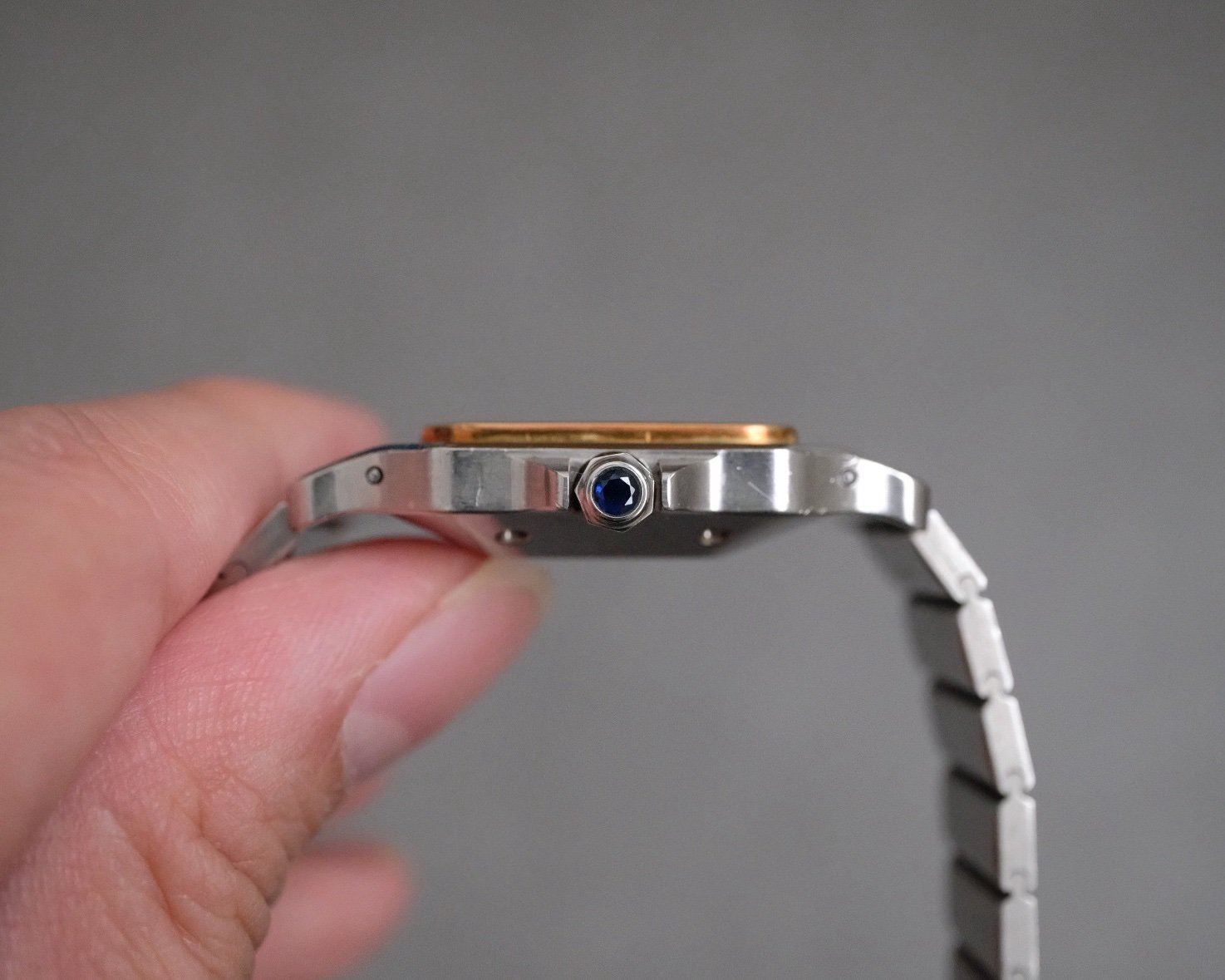 - Case: Stainless steel with 18K yellow gold bezel, 29 x 41 mm
