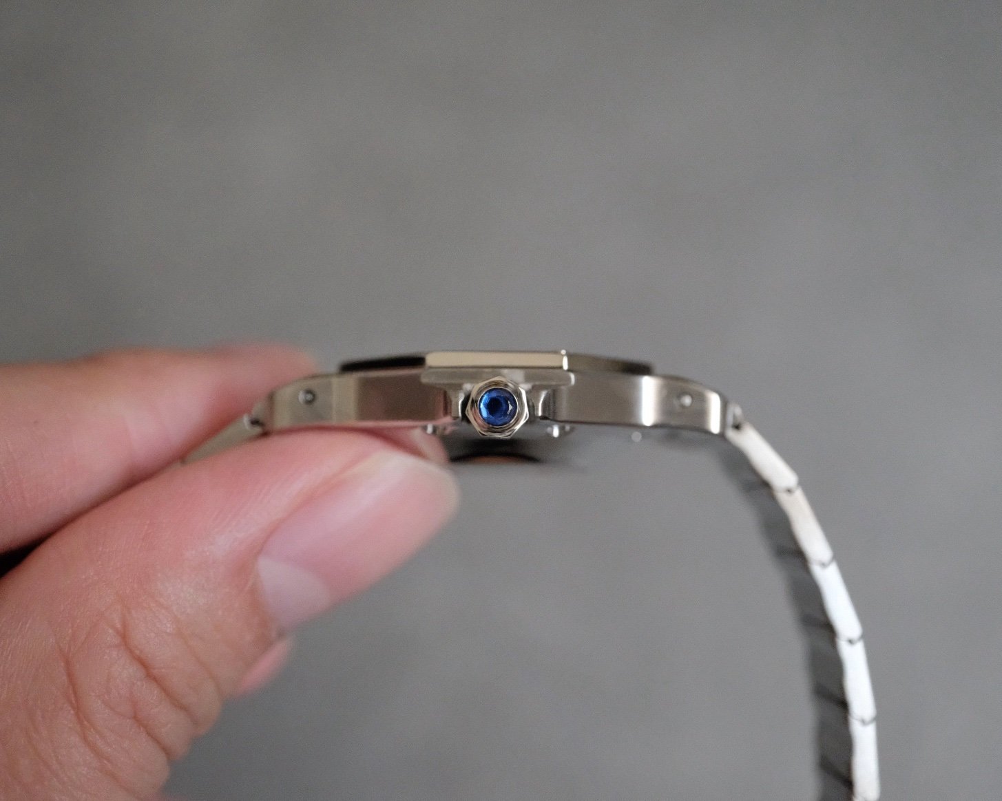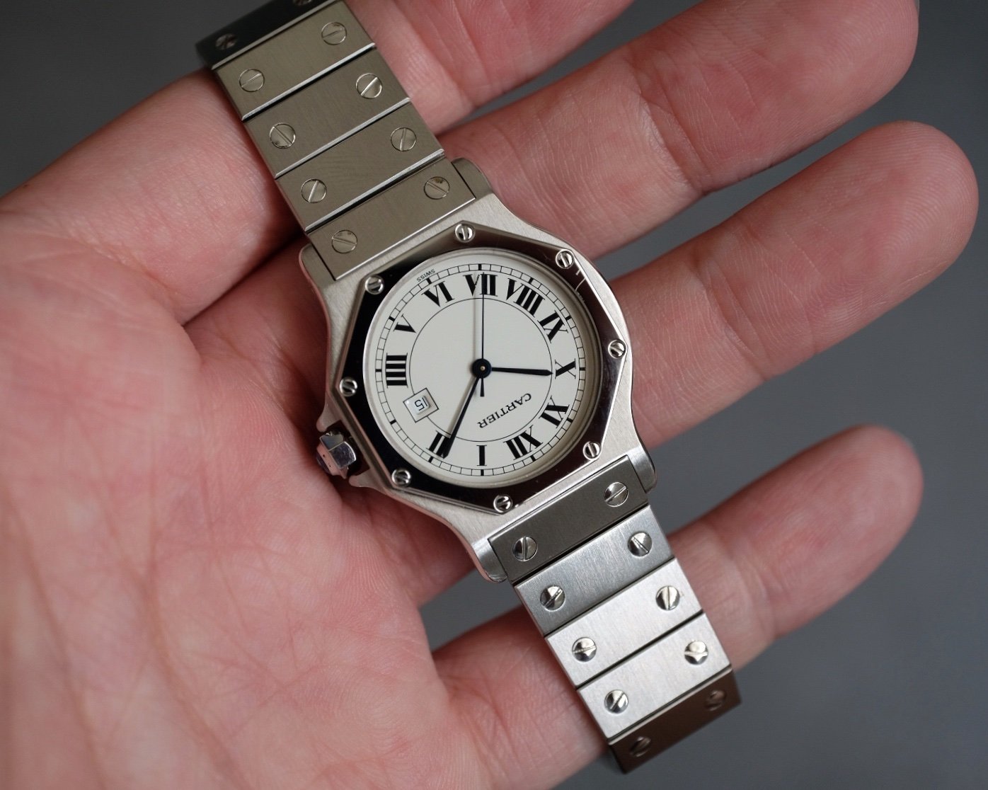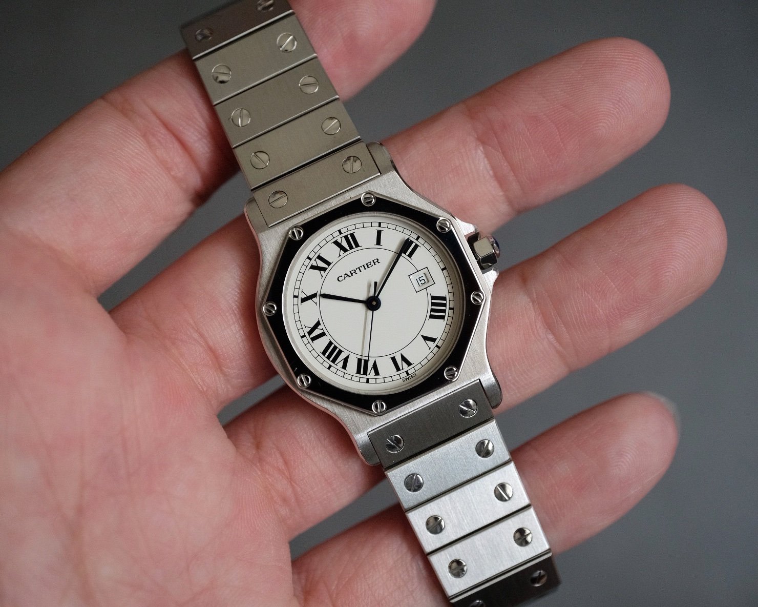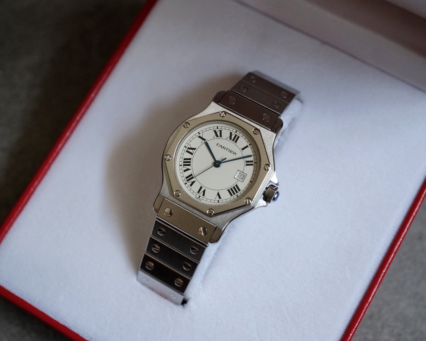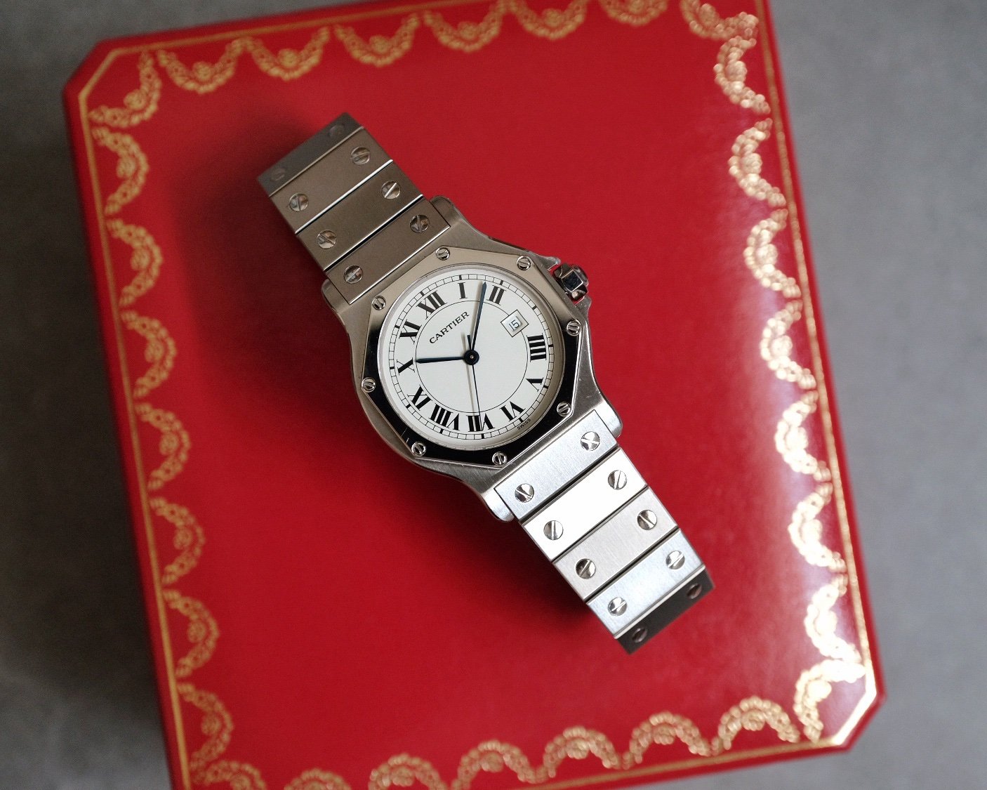 A distinctive chapter in the Santos lineage, the Santos Octagon brings a different perspective to Cartier’s iconic design language. Its softly faceted case and integrated bracelet create a unique silhouette that stands apart from the traditional square Santos. This example features a warm cream dial with Roman numerals and blued hands. A piece that captures the charm of Cartier’s neo-vintage era, where design experimentation meets timeless refinement.