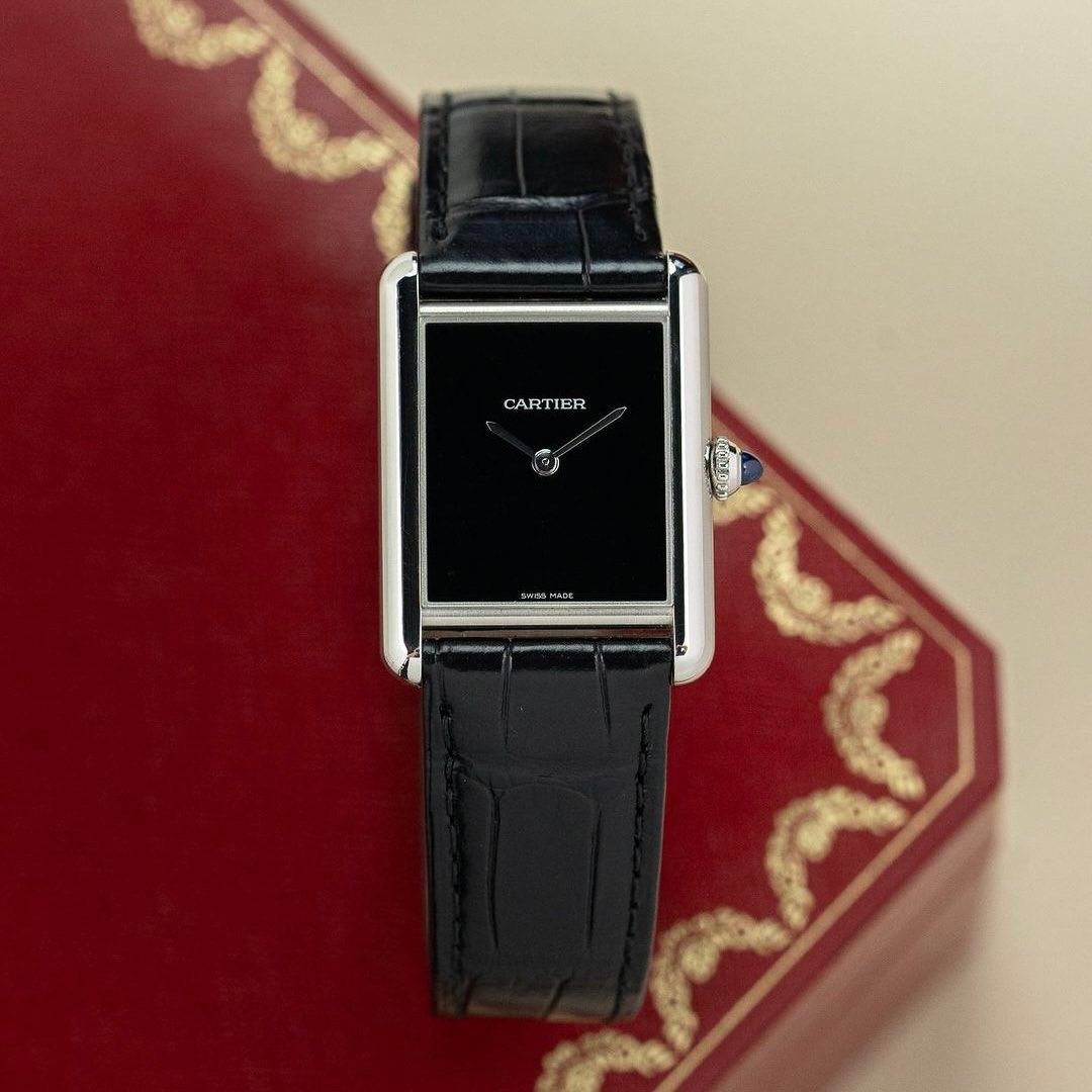 This model features a striking black lacquered dial that radiates understated elegance while ensuring optimal readability. Encased in stainless steel, the watch offers durability alongside a polished finish that catches the light beautifully. The distinctive Roman numerals, paired with sword-shaped hands and a silver-tone frame, showcase Cartier’s flair for blending tradition with contemporary appeal.