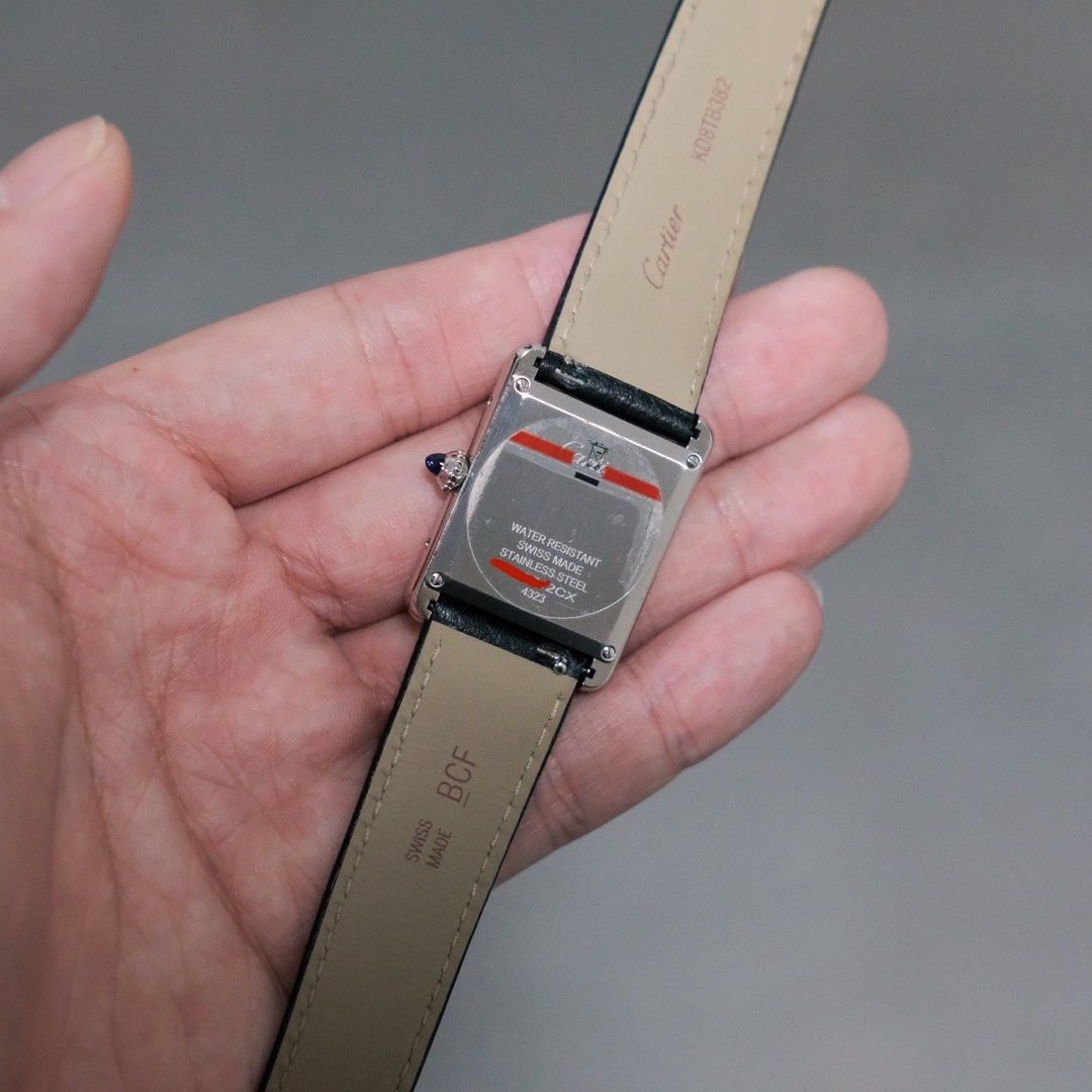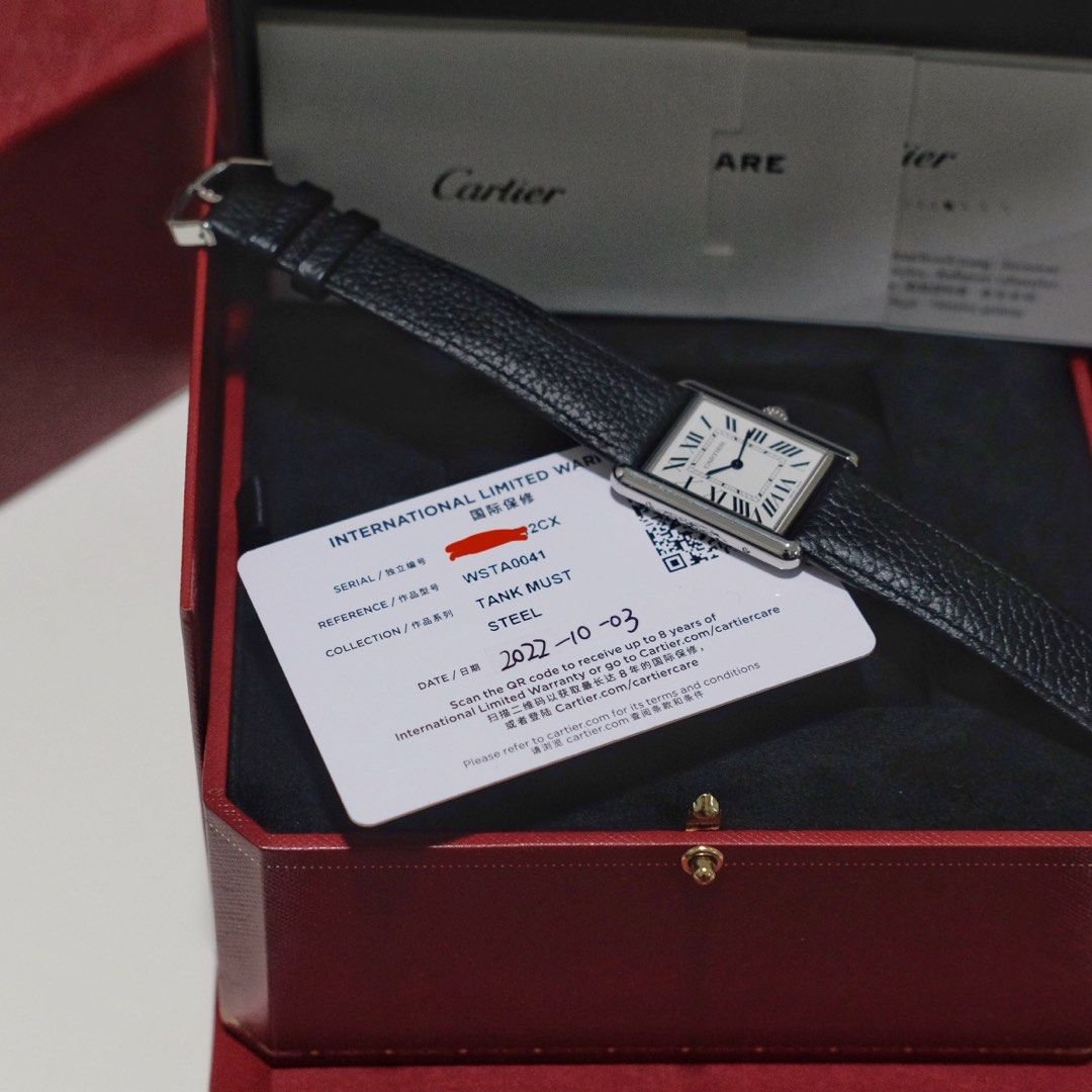 The Cartier Tank Must Large Ref. WSTA0041 combines timeless elegance with modern sophistication. Its rectangular stainless steel case frames a satin-brushed silver dial with Roman numerals and blue sword-shaped hands. Powered by a reliable quartz movement and paired with a black leather strap, this watch delivers precision, style, and versatility for both daily wear and special occasions.