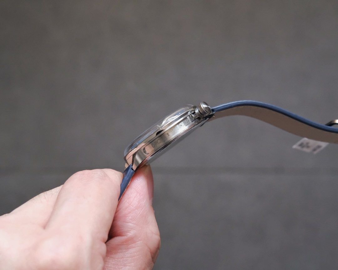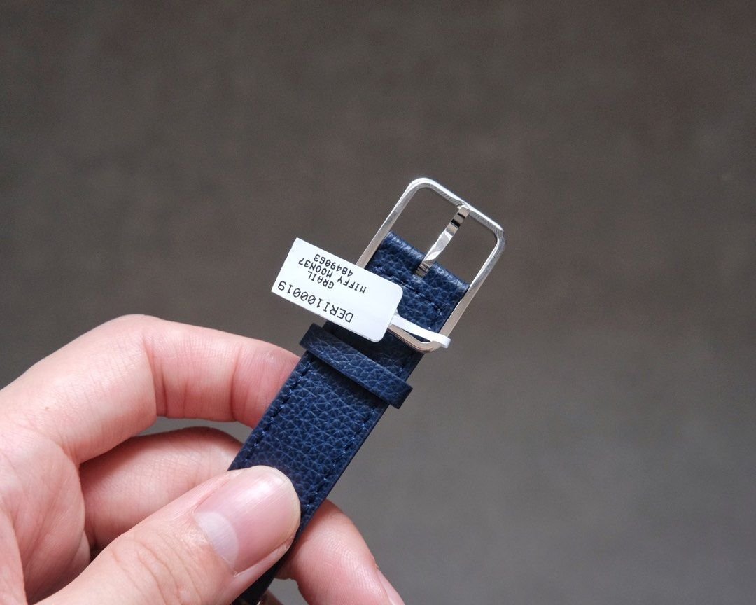- Strap: Blue leather with stainless steel pin buckle