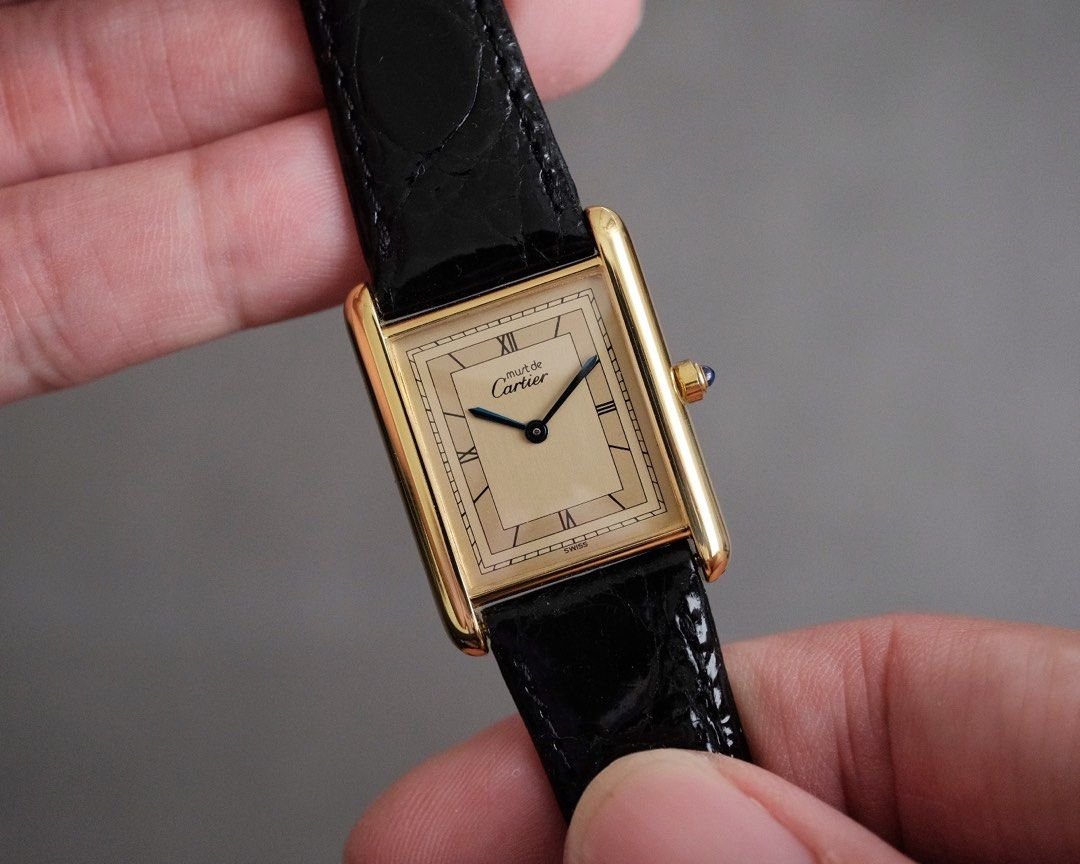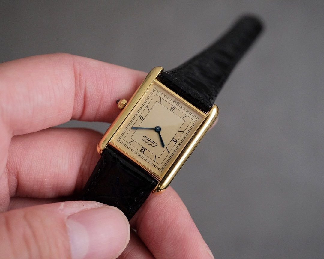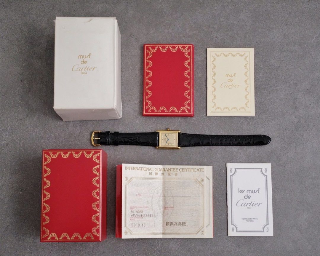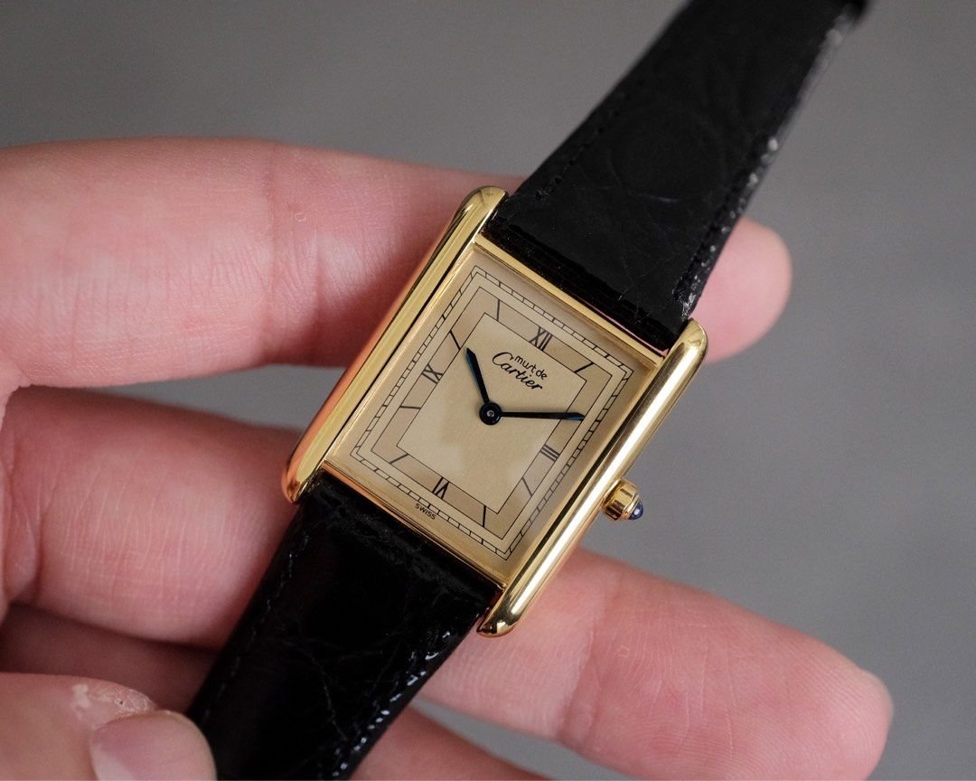 The Must de Cartier Tank Vermeil LM Ref. 681006 features a rectangular vermeil case, gold-tone dial with jumping roman numeral indices and a black leather strap. Powered by a precise quartz movement, this watch epitomizes Cartier’s classic elegance and enduring craftsmanship.