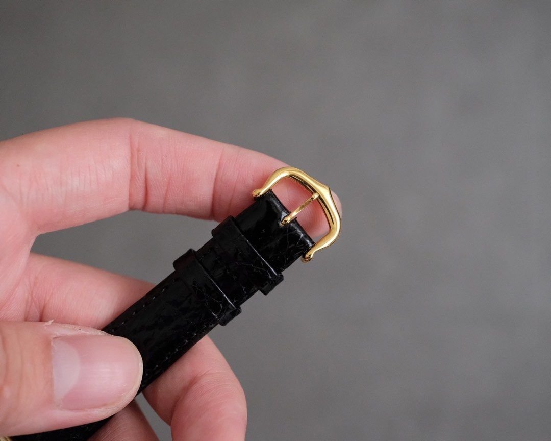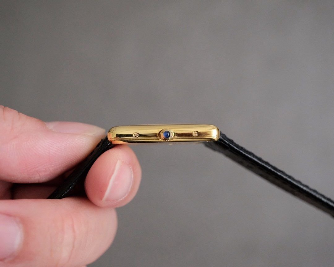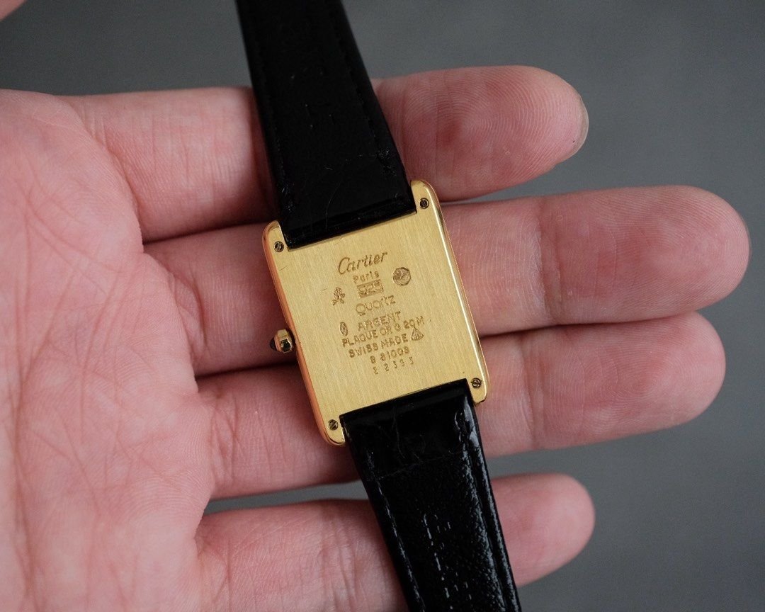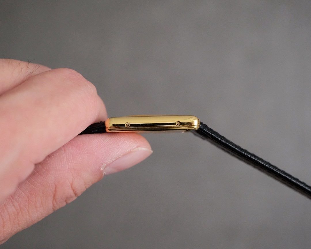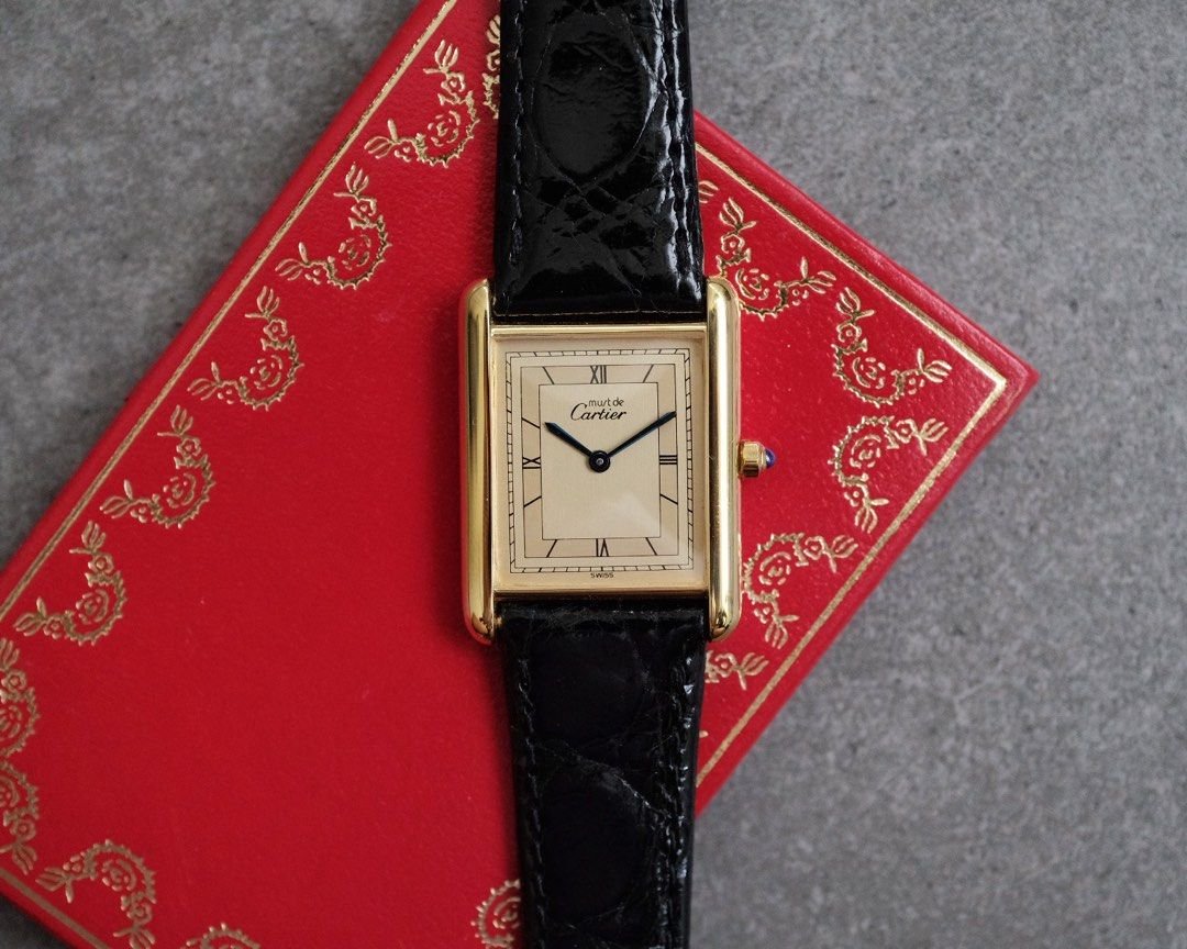 The Must de Cartier Tank Vermeil LM Ref. 681006 features a rectangular vermeil case, gold-tone dial with jumping roman numeral indices and a black leather strap. Powered by a precise quartz movement, this watch epitomizes Cartier’s classic elegance and enduring craftsmanship.