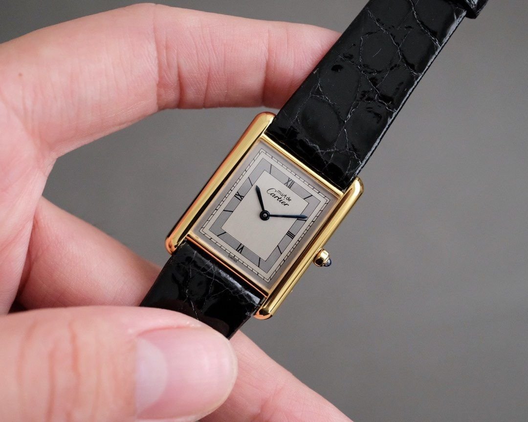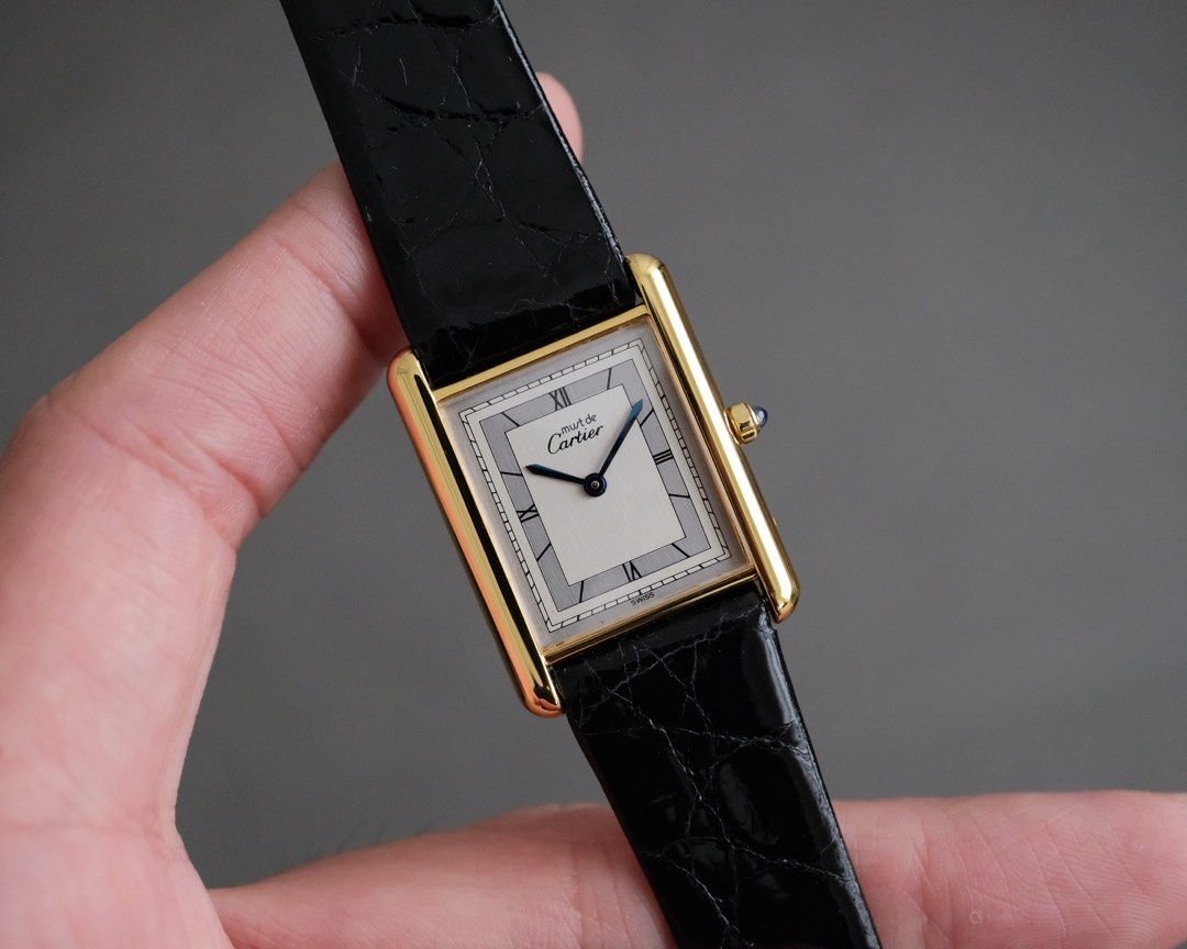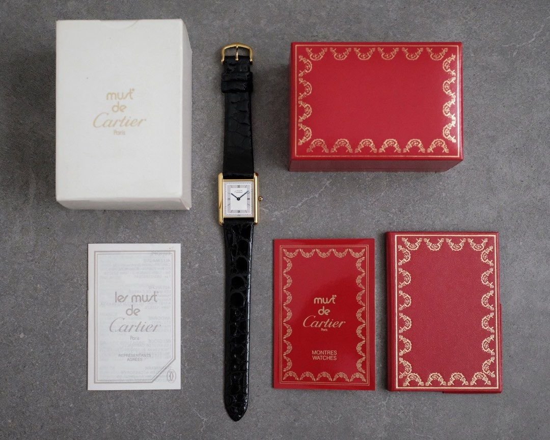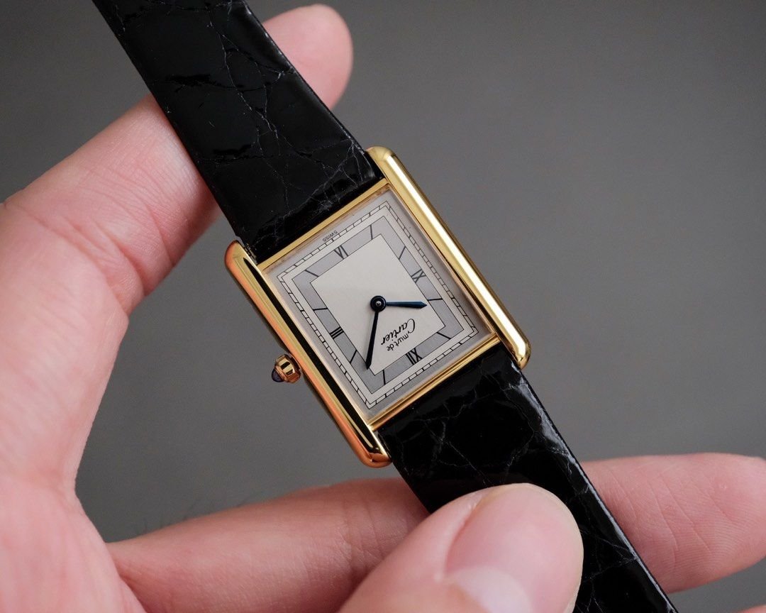 The Must de Cartier Tank Vermeil LM Ref. 681006 features a rectangular vermeil case, dual-tone dial with sub Roman numerals, and a black leather strap. Powered by a precise quartz movement, this watch epitomizes Cartier’s classic elegance and enduring craftsmanship.