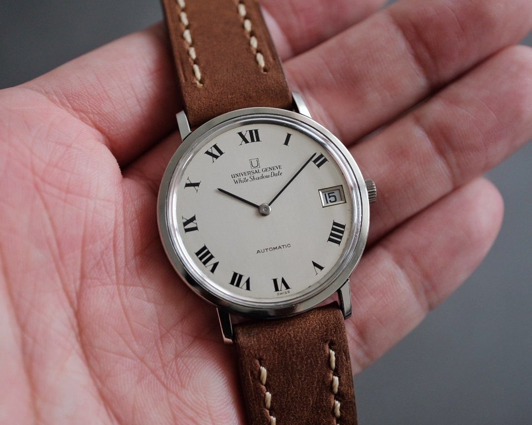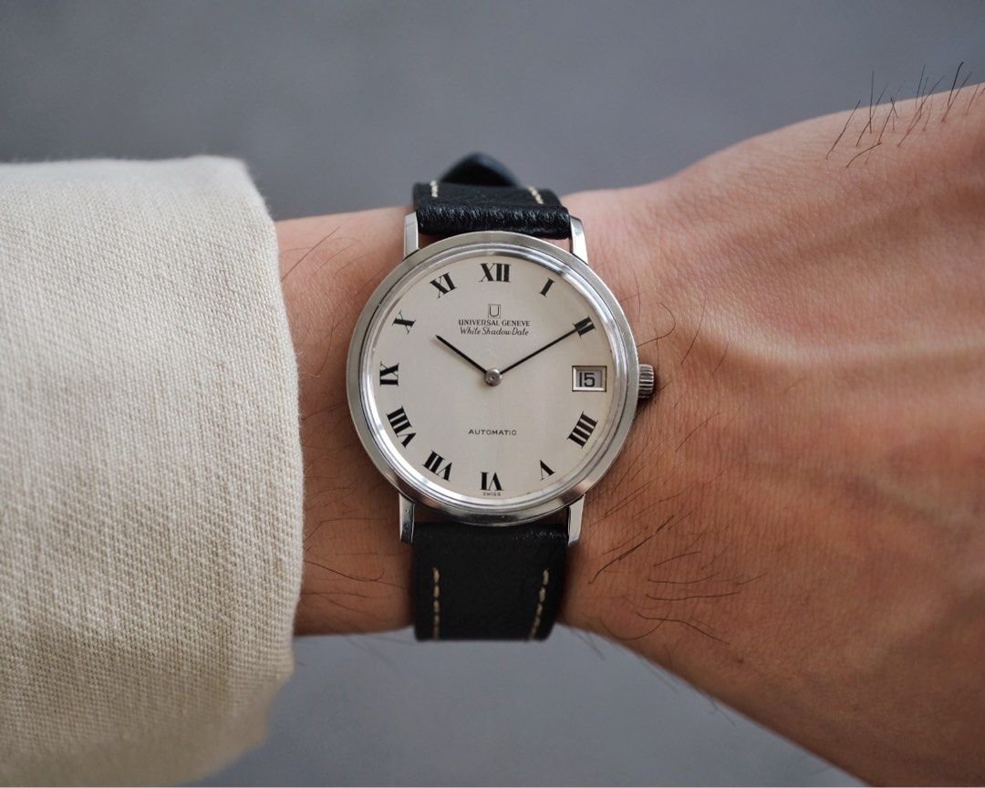 The Universal Geneve White Shadow Date Automatic blends timeless elegance with precise Swiss engineering. Its sleek stainless steel case houses a clean white dial with polished hour markers and a date window, paired with a comfortable strap. Powered by an automatic movement, this watch offers reliable performance and understated sophistication, perfect for both formal occasions and everyday wear.