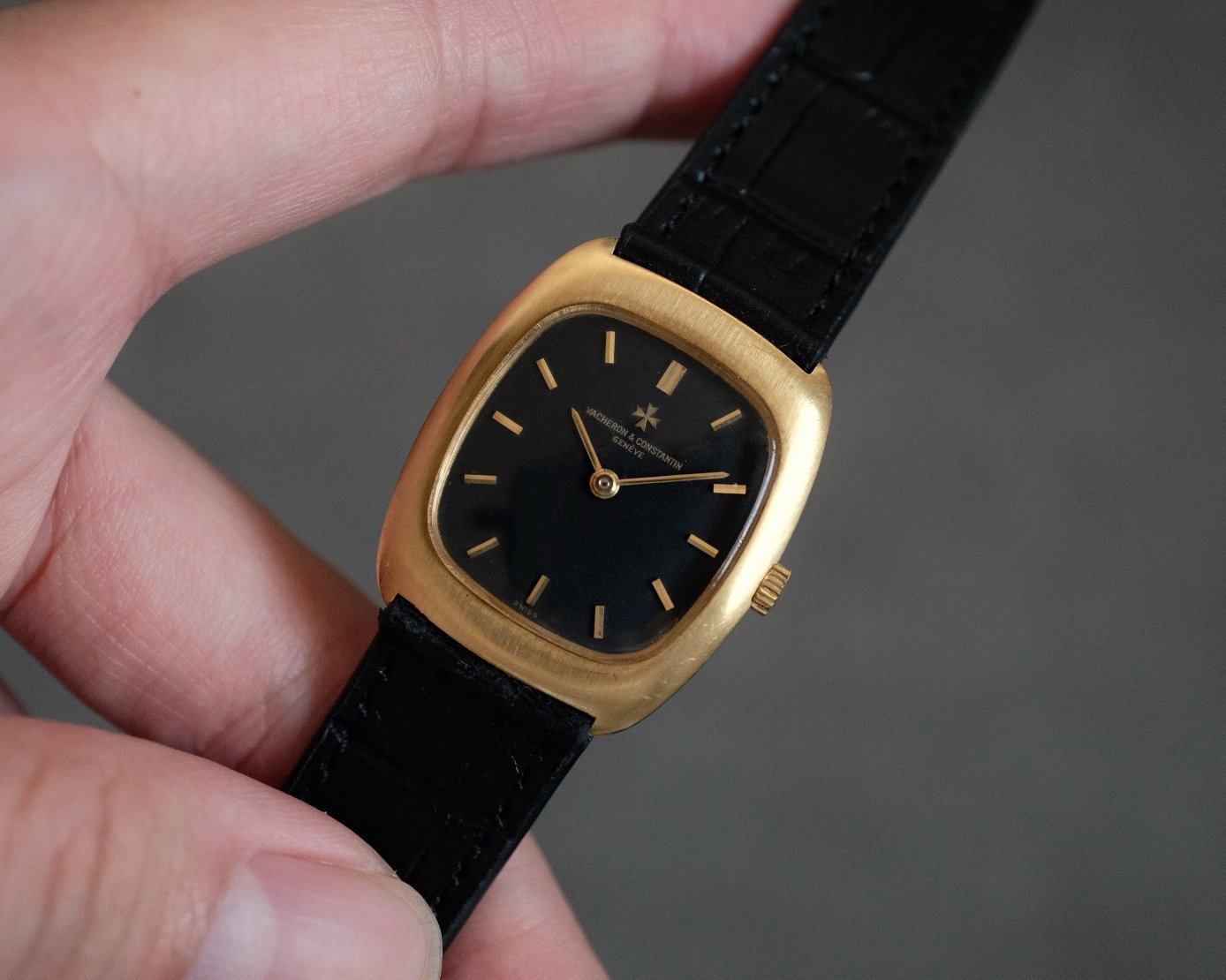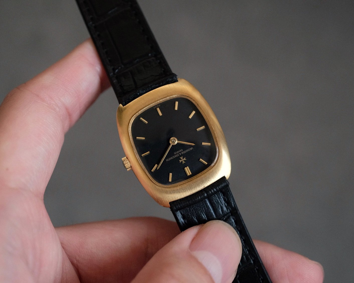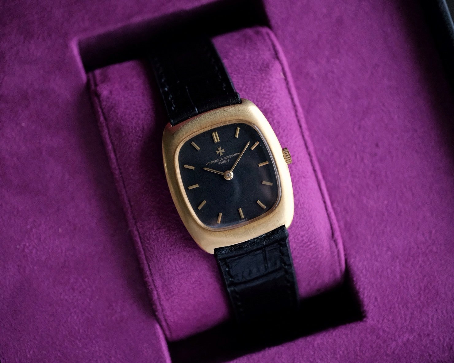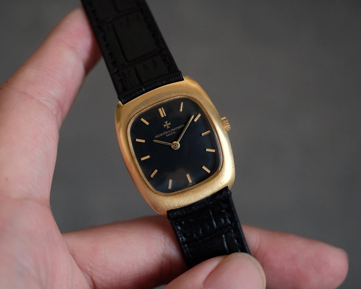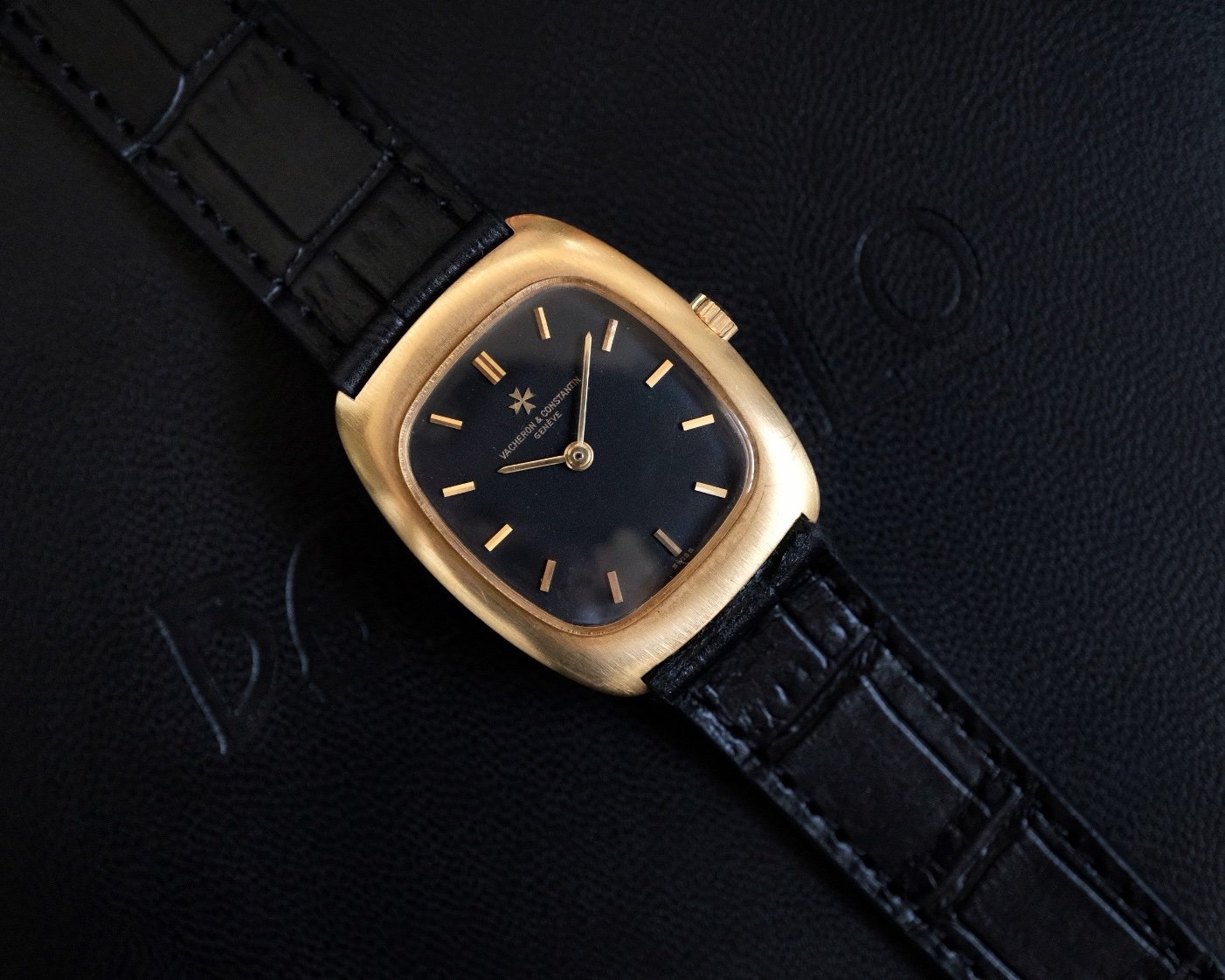 Vacheron Constantin Ellipse Classic crafted in 18k yellow gold Ref. 2019A, featuring a matte black dial accented by gold indices and hands. The watch is powered by a traditional 17-jewel manual-wind mechanical movement Cal. K1014. Housed in an elegant tonneau-shaped case measuring 32mm × 27.5mm, it offers unisex proportions and refined vintage appeal.